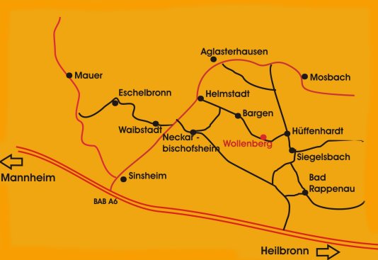 Wollenberg liegt zwischen Heilbronn und Heidelberg - zwischen Mosbach, Sinsheim und Bad Rappenau.- Wenn Sie von weiterher kommen fahren Sie aus Richtung Heidelberg, Mannheim AB - Abfahrt Sinsheim. Dann Richtung Waibstadt, Helmstadt, Bargen, Wollenberg. Vor Wollenberg rechts dann gleich links, rechts über die Brücke, nach 50 m links den Berg hoch.-Aus Richtung Heilbronn AB - Abfahrt Bad Rappenau. Dann Richtung Siegelsbach, Hüffenhardt, Wollenberg. In Wollenberg bei der Kirche links über die Brücke dann rechts, nächste links und wieder links den Berg hoch und schon sehen sie unseren Fachwerkgiebel. |